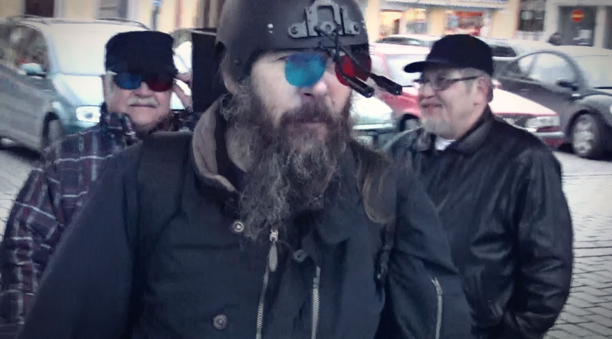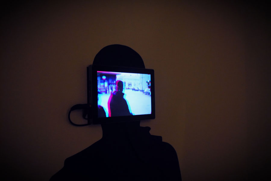一对usb摄像头安装在了头盔前方,并通过便携式蓄电池供电的迷你电脑和一个安置在头盔后方的8.9英寸的液晶显示屏链接在一起,上面显示的是通过3D软件再现表演者视线前方的三维景象。观众可以通过佩戴3D红蓝立体眼镜“看穿”他/她的头部。