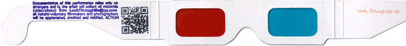 正式的行走将于2012年秋在香港的商业街发生,这次艺术家穿戴装置只身一人同街道发生互动并求取记录素材,背包后提供印有文字的纸质红蓝眼镜的方式传达信息:"此装置行为的影像记录完全仰仗陌路人和你,艺术家会从LookThroughMe@qq.com这个邮箱收集的素材进行编辑,感激所有参与并上传了的即时自愿摄像师和摄影师,列入人名表并回复通知。ACTION!"